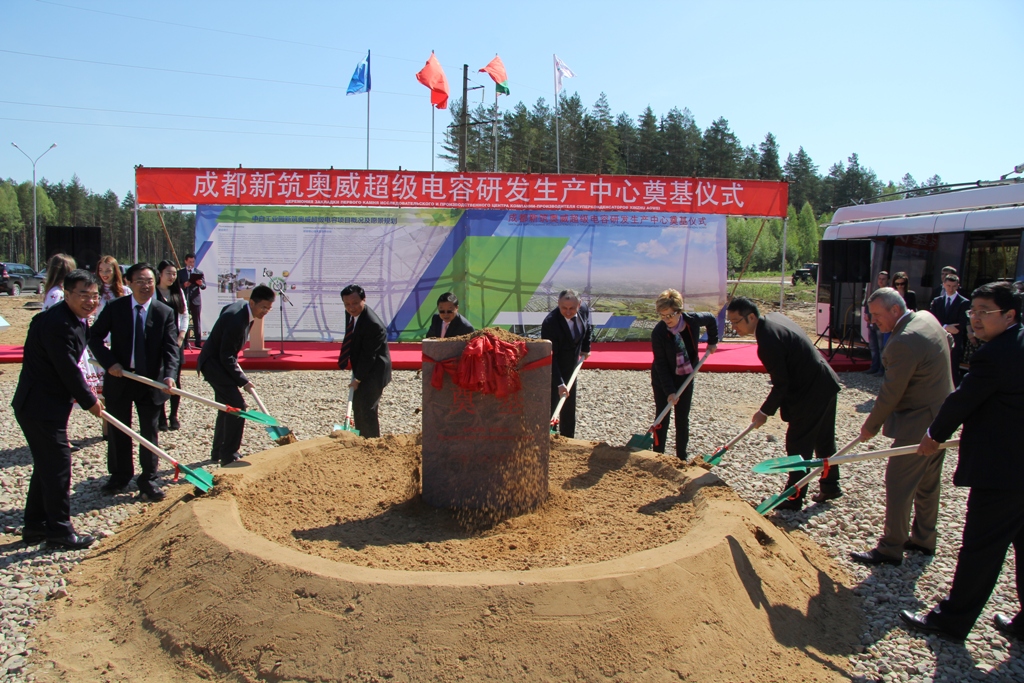 (圖為白俄羅斯經濟部副部長雅羅申科、明斯克市副市長讓娜女士、四川省發改委主任唐利民、中國駐白俄羅斯使館經商參處參贊劉雪松、招商局董事、中白合資公司CEO胡政、中白合資公司總經理李海欣、成都新筑公司副總裁杜曉峰、明斯克市政機車廠總經理卡爾等為成都新筑奧威超級電容研發生產中心進行奠基培土。)