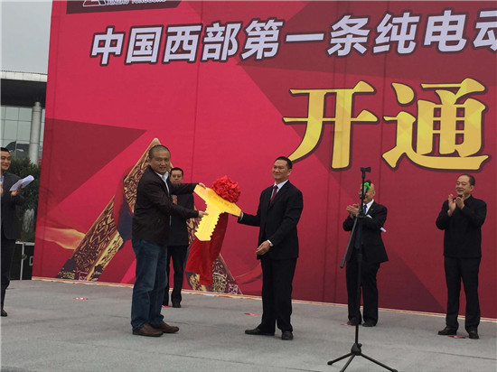 ? ? ? 儀式上,新筑通工公司與蜀通公司進行了車輛鑰匙的成功交接。18日雅安東站的開通儀式現場熱鬧非凡,6臺嶄新的7路公交車映入大家眼簾:車輛外部潔凈閃亮,車輛內部寬敞舒適,電視、空調一應俱全。此時的公交車旁早已圍滿了熱心市民,大家對于新公交車的電動環保概念以及車輛整體的新穎贊不絕口,都想立刻上車成為第一批乘客。