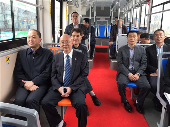 (雅安市委副書記、市長蘭開馳,市政府副市長王冬林,新筑公司總裁馮克敏等領導乘坐體驗新公交)
