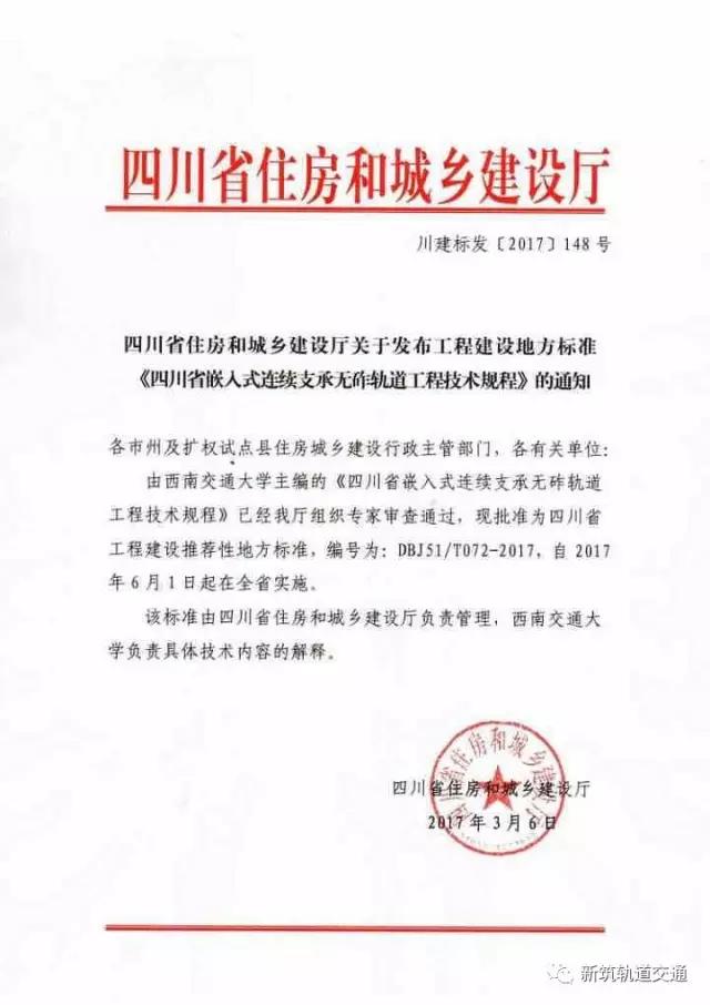 ? ? ? ?2017年3月,四川省住房和城鄉建設廳正式批準了《四川省嵌入式連續支承無砟軌道工程技術規程》為四川省建設推薦性地方標準,編號為DBJ51/T072-2017,將在2017年6月1日起在全省實施。該規程涵蓋了嵌入式連續支承無砟軌道設計、施工、驗收和養護維修等多個方面,是四川省城市軌道交通行業首個行政服務的地方標準。