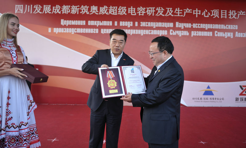 ? ? ? 在投產(chǎn)運(yùn)營儀式上,四川發(fā)展成都市新筑路橋機(jī)械股份有限公司黨委書記、董事長肖光輝先生發(fā)表致辭回顧了四川發(fā)展成都新筑股份“中白工業(yè)園”項(xiàng)目的發(fā)展歷程,肯定了公司在“中白工業(yè)園”項(xiàng)目取得的成績,并祝愿四川發(fā)展成都新筑、上海奧威和BKM公司的合作能夠在未來取得更加輝煌的成功。白俄羅斯經(jīng)濟(jì)部副部長馬圖謝維奇先生在儀式上致辭并提出“中白工業(yè)園”是“一帶一路”倡議的重要平臺(tái),對(duì)中白兩國關(guān)系具有重要戰(zhàn)略意義,四川發(fā)展成都新筑“中白工業(yè)園”項(xiàng)目是中白兩國企業(yè)合作的典范。為表彰四川發(fā)展成都新筑奧威超級(jí)電容研發(fā)及生產(chǎn)中心成為園區(qū)第一個(gè)投產(chǎn)運(yùn)營及產(chǎn)品下線的高科技生產(chǎn)型項(xiàng)目,中白工業(yè)園合資公司總經(jīng)理李海欣先生在儀式上向四川發(fā)展新筑股份黨委書記、董事長肖光輝先生頒發(fā)了中白工業(yè)園“巨石”貢獻(xiàn)獎(jiǎng)證書。