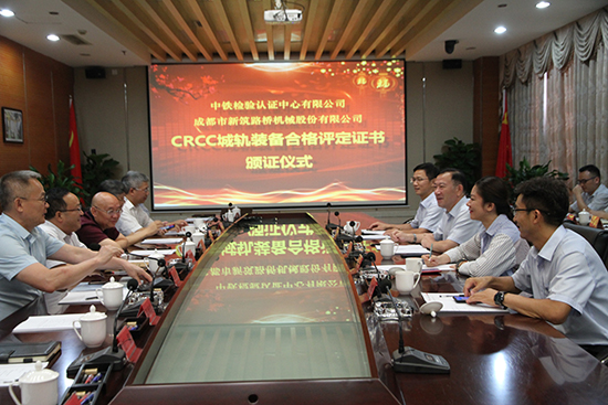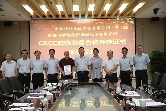 ????? 2019年7月30日,中國首張有軌電車CRCC“城軌裝備合格評(píng)定證書”頒證儀式在成都市新筑路橋機(jī)械股份有限公司(以下簡稱“公司”)總部隆重舉行。中鐵檢驗(yàn)認(rèn)證中心有限公司(以下簡稱“CRCC”)執(zhí)行董事、主任劉越、CRCC城規(guī)業(yè)務(wù)總監(jiān)孫超、CRCC機(jī)車車輛檢驗(yàn)站副站長黃健,成都市經(jīng)信委軌道處劉莎副處長,公司黨委書記、董事長肖光輝、副董事長馮克敏、總裁楊永林等公司領(lǐng)導(dǎo)出席了頒證儀式。