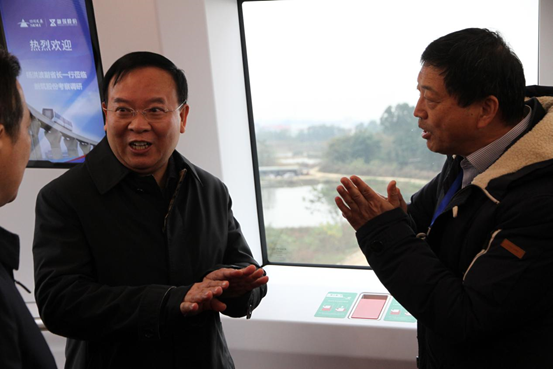 楊洪波副省長首先來到新筑股份普興軌道交通產業基地,視察了新筑股份內嵌式中低速磁浮綜合試驗線,詳細聽取了試驗線建設情況和磁浮車輛性能等方面講解,并試乘體驗了內嵌式中低速磁浮交通系統。