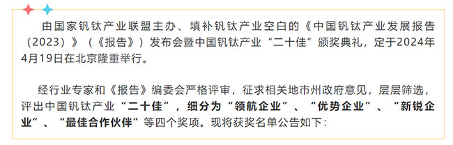 由國家釩鈦產業聯盟主辦、填補釩鈦產業空白的《中國釩鈦產業發展報告(2023)》(《報告》)發布會暨中國釩鈦產業“二十佳”頒獎典禮,定于2024年4月19日在北京隆重舉行。