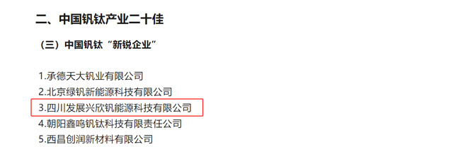 經行業專家和《報告》編委會嚴格評審,征求相關地市州政府意見,層層篩選評出中國釩鈦產業“二十佳”,細分為“領航企業”、“優勢企業”、“新銳企業”、“最佳合作伙伴”等四個獎項。公司控股子公司四川發展興欣釩能源科技有限公司(以下簡稱“川發興能”)榮獲中國釩鈦產業“二十佳”“新銳企業”。